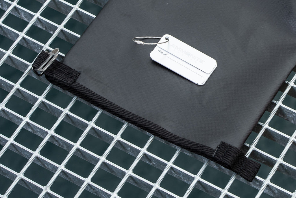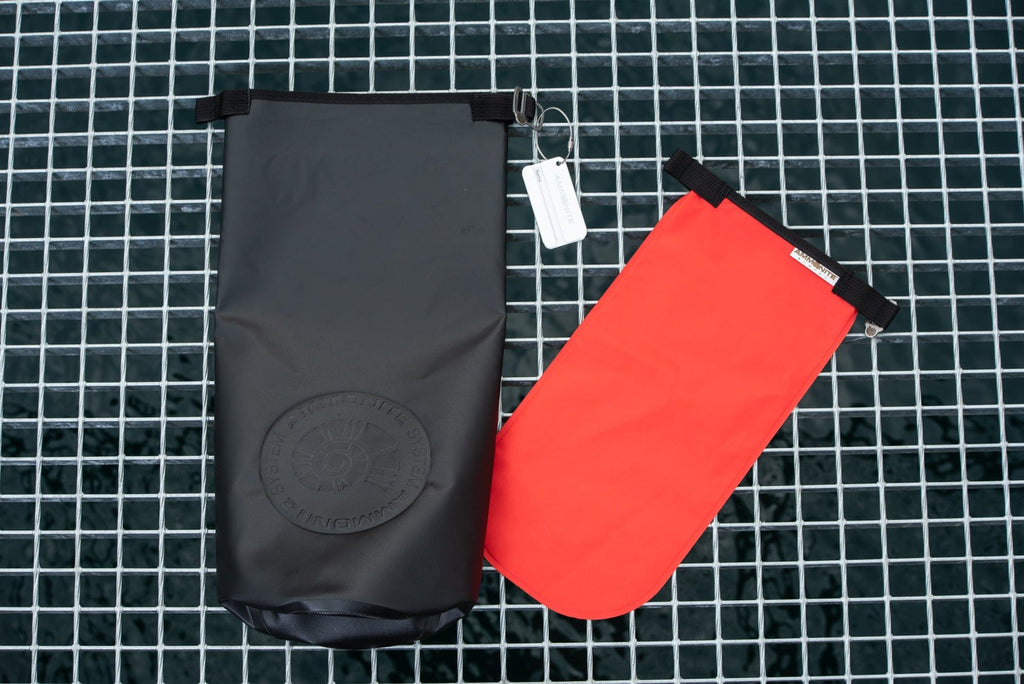 A useful feature while diving from a boat, exploring caves, etc. An addition to the bags is an aluminium luggage tag on a steel cord with a name and address label decorated with large Ammonite System logo.