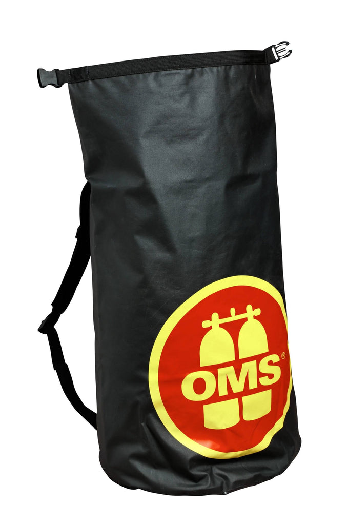 A strip of {1 in | 2.5 cm} nylon webbing reinforces the closure top with SR buckle for a secure seal when folded over and clipped shut. Lightweight and breathable shoulder straps sewn onto one side offer a comfortable and convenient hands-free carrying method. It also includes a chest strap with SR buckle for proper weight distribution when full of gear. Approximate height of {33 in | 83.8 cm} when not closed and width of {21 in | 53.3 cm}. Large OMS logo screen printed on front.