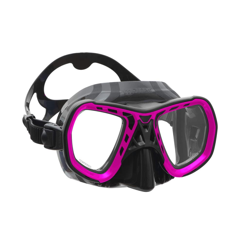 The Spyder goggle features a soft, mesh-like rubber nose pad and a secure grip to properly position the mask on your face. The skirt features original grooves with a unique hydrodynamic shape for reducing drag while in the water. The unique side knobs and a raised grip on the nose facilitate compensation. Here are the main features of the Spyder spearfishing mask: