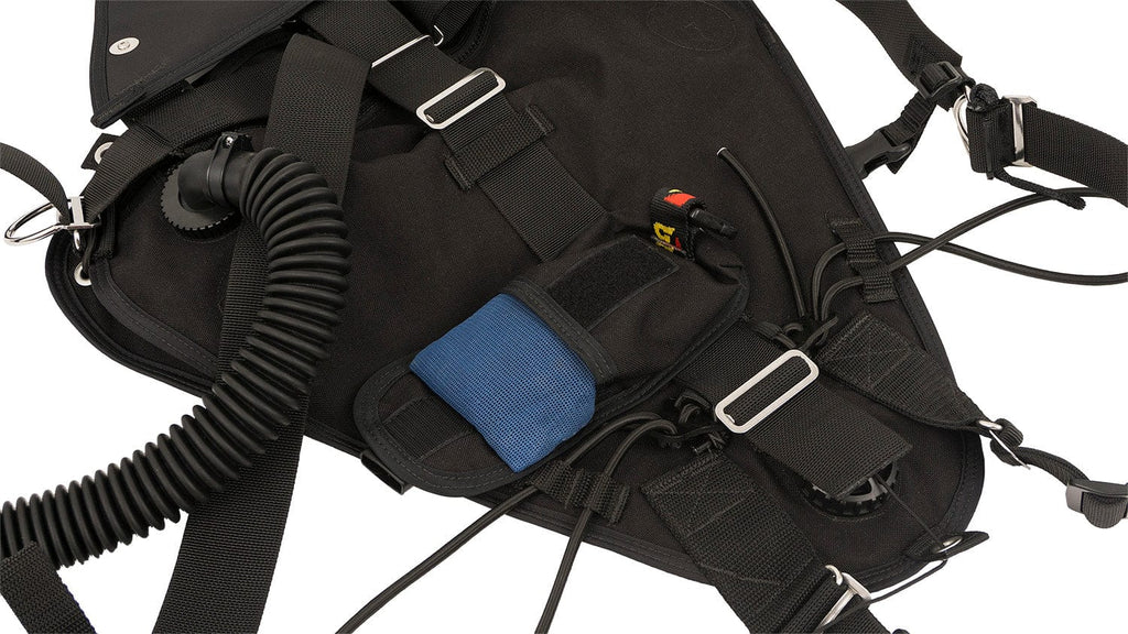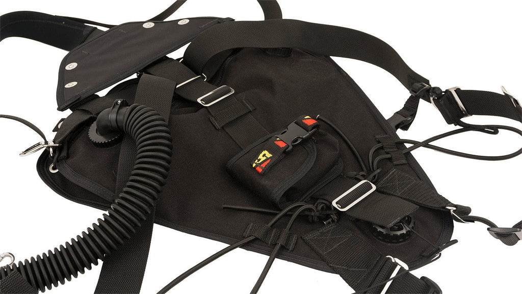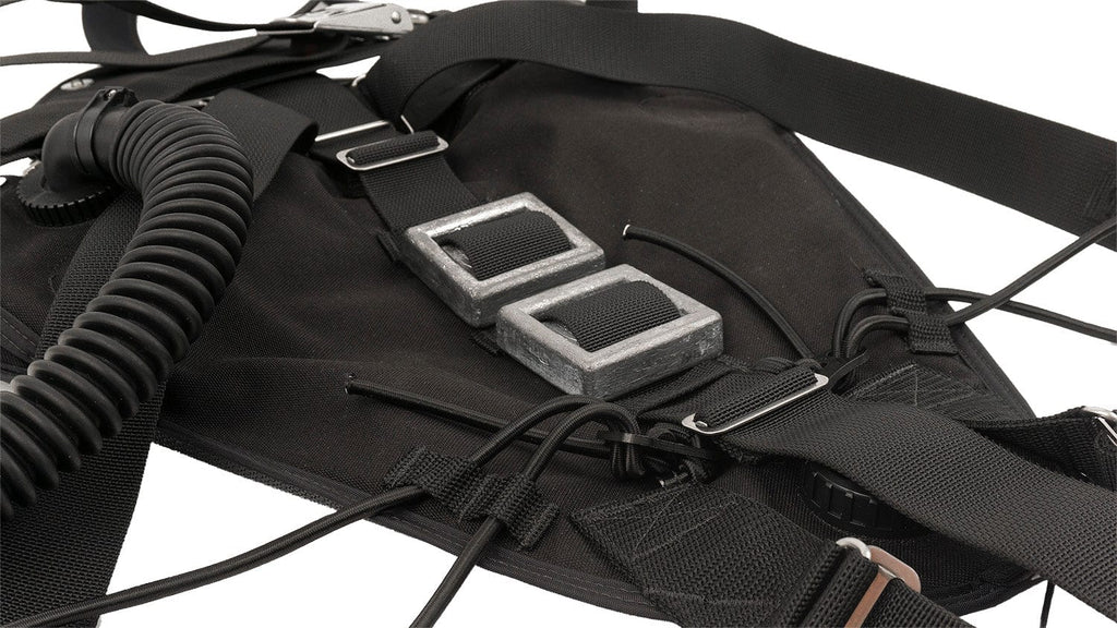 Adjustable Bungee System allows the diver to choose between ring, loop, or independent bungees. The laser cut adjustment plate allows for infinite adjustment to fine tune bungee length.