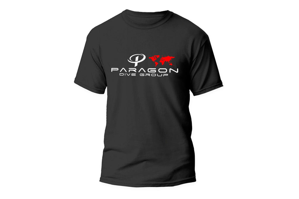 Shirt is Black and the back is as pictured. The front has the Paragon Dive Group logo across the front of the chest.