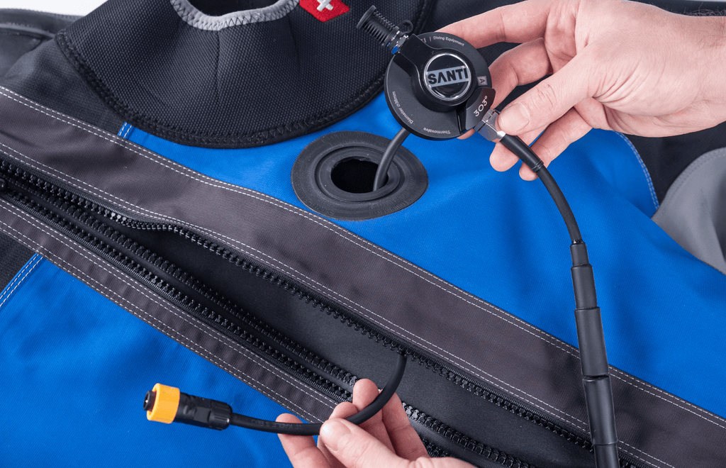 SANTI Thermovalve works as a regular valve. Also, it allows for collision-free connection of the inner layers of diving gear (vest or undersuit) by means of properly integrated wiring which can be powered by the batteries up to 12V outside the drysuit.