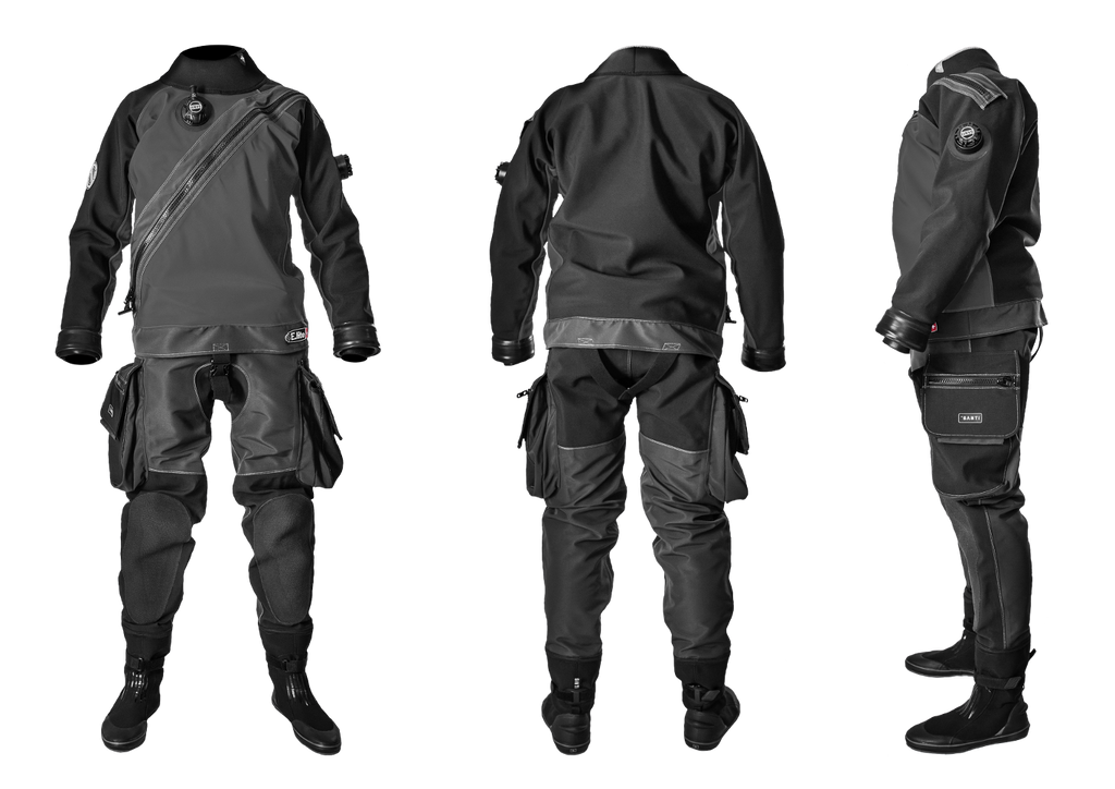 SANTI E-Lite Plus drysuit presents an optimal and advanced combination of durability and modern textile technology dedicated to extreme sports. The E.Lite+ model is based on the exceptional quality of the E.Lite model, however, it has been supplemented with a new, flexible and soft to the touch fabric, which even further increases the comfort of diving. Critical points, particularly vulnerable to damage and abrasion, have been adequately protected with a durable E.Lite fabric, which was created exclusively for Santi.