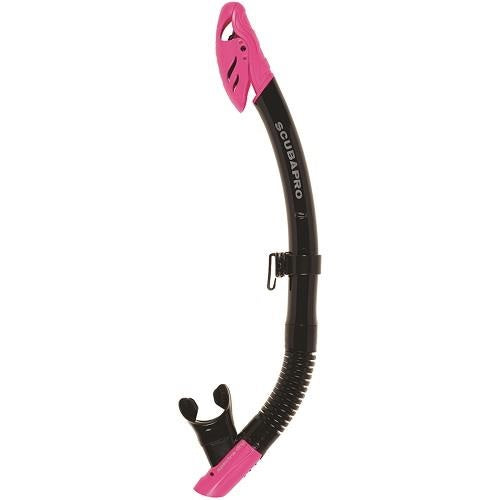 This snorkel is tops when it comes to breathing comfort and ease of clearing. The large-bore upper tube is rigid for stability and allows plenty of airflow, while the corrugated lower tube can be easily positioned when being used, and hangs out of the way when not being used. The semi-dry top helps prevent water from entering, the purge valve positioned at the lowest point makes quick work of any water that does sneak in.