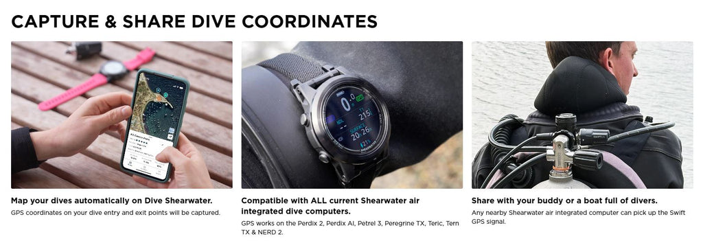 Every Shearwater air integrated dive computer can lock in your dive site location coordinates with the Swift GPS. Get more than the benefits of air integration when you capture your dive's entry and exit points, and add maps to your Dive Shearwater log.