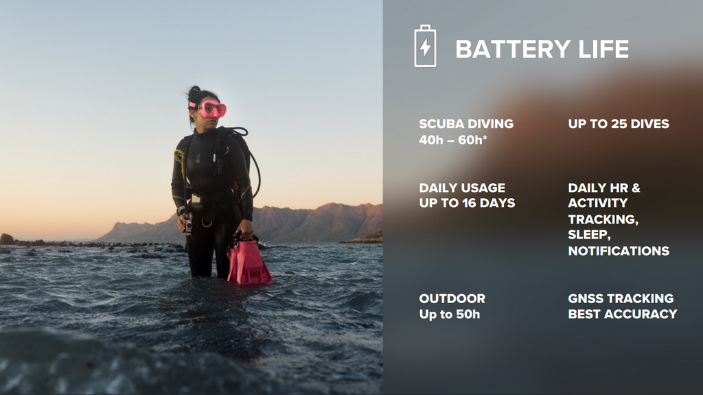 - Freedive mode: Monitor your dives with separate underwater and surface views. Multiple alarms for depth, dive time, and ascent/descent speed.