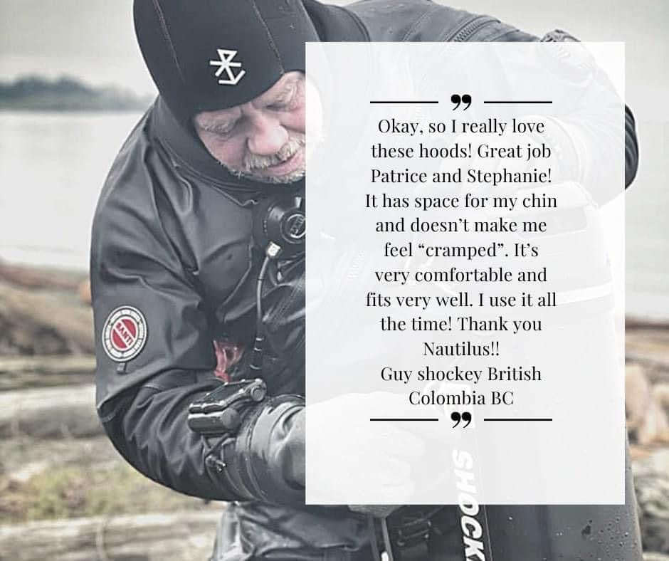 "Now then, let's talk about this a little. When it comes to my dive gear I'm pretty picky about what I use. Over the last week I was introduced to and, was able to get my hands on, just the best hood I've ever used. It's called a YRVA and, it's made in Canada. The previous hood I've been using was made of a similar neoprene but made it incredibly hard to move my jaw. This hood on the other hand fits the contours of my face far better and does not gerbil my face. What is even more astounding is that despite being only a 5MM it is every bit as warm if not warmer than my 10MM. I can't say enough good things about it. This hood certainly brings toasty!"